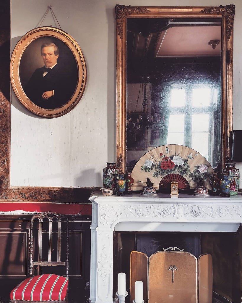 As we stepped through the double doors over the threshold, we were met with the grand and sweeping marble staircase and I immediately had a good feeling and one of welcome. A light and happy home. There was a scent like a cathedral - that slight humidity of old stone mixed with candle wax or incense but somehow pleasant and nostalgic. We were guided left into the west wing with a set of 2 salons that met enfilade. The first was very much in a state of project and yet the bones were beautiful: red marble fireplace, original wainscotting or boiserie, a 19th century grand crystal chandelier. It just needed refreshing rather than major work. This room led into what was termed The Red Salon. And wow, this was like stepping back into another century: a quiet faded grandeur of vast dark, plasterwork, high ceilings and beautiful Versailles parquet. A grand sculpted marble fireplace depicted clusters of bluebells and the room had a panoramic vista across the château court and moat. It had been left untouched since it was built and while the wallpaper was peeling and cobweb spun like fine silk needlework across the details is was still beautiful.